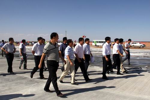 8月21日,由喬新山局長率領(lǐng)的民航西北管理局工作檢查組一行蒞臨金昌機(jī)場飛行區(qū)施工現(xiàn)場檢查指導(dǎo)工作。在飛行區(qū)停機(jī)坪建設(shè)工地,在了解到公司金昌機(jī)場項目部僅用了二十五個晝夜完成了總面積2.65萬平方米停機(jī)坪道面工程的情況后,對大家的辛勤勞動給予了充分肯定,并鼓勵廣大建設(shè)者繼續(xù)鼓足干勁、克服困難,發(fā)揚求真務(wù)實、艱苦奮斗的作風(fēng),確保工程按期完工。