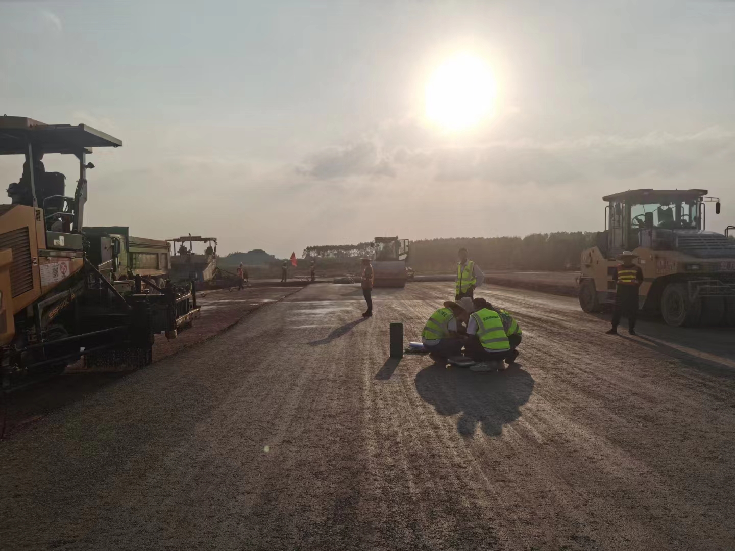 為確保試驗(yàn)段攤鋪設(shè)備工作高質(zhì)、高效進(jìn)行,項(xiàng)目部統(tǒng)一部署,各部門相互配合,認(rèn)真進(jìn)行施工前各項(xiàng)準(zhǔn)備工作,提前對有關(guān)人員進(jìn)行安全培訓(xùn)和技術(shù)交底。施工現(xiàn)場井然有序,項(xiàng)目負(fù)責(zé)人嚴(yán)格把控運(yùn)輸、攤鋪、碾壓、檢測等各施工環(huán)節(jié),保證施工質(zhì)量與安全,同時(shí)對試驗(yàn)段標(biāo)高、壓實(shí)度、平整度和厚度等各項(xiàng)指標(biāo)進(jìn)行實(shí)時(shí)檢測并記錄,確保各項(xiàng)指標(biāo)符合技術(shù)規(guī)范要求,并確定水穩(wěn)層松鋪系數(shù)、壓路機(jī)最佳碾壓遍數(shù)及速率,最終達(dá)到預(yù)期試驗(yàn)效果。