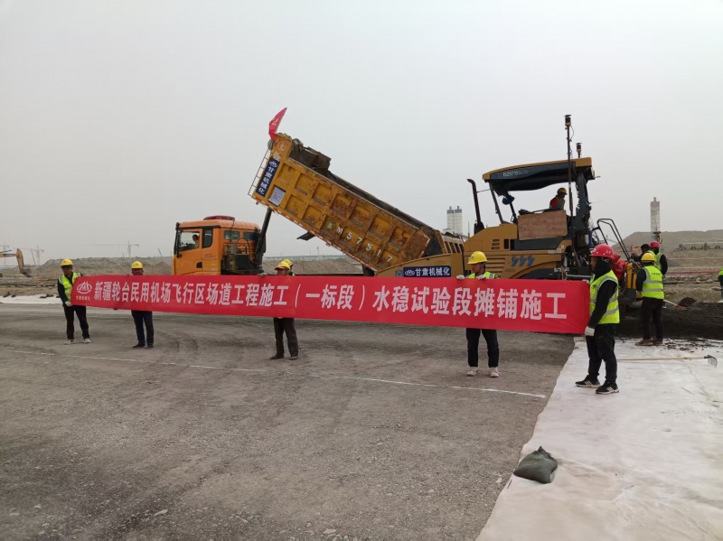 3月27日,新疆輪臺民用機(jī)場項目現(xiàn)場,隨著首車水泥穩(wěn)定砂礫混合料倒入攤鋪機(jī),其緩緩啟動,我司承建的該項目飛行區(qū)場道工程(一標(biāo)段)水穩(wěn)基層施工正式開啟。